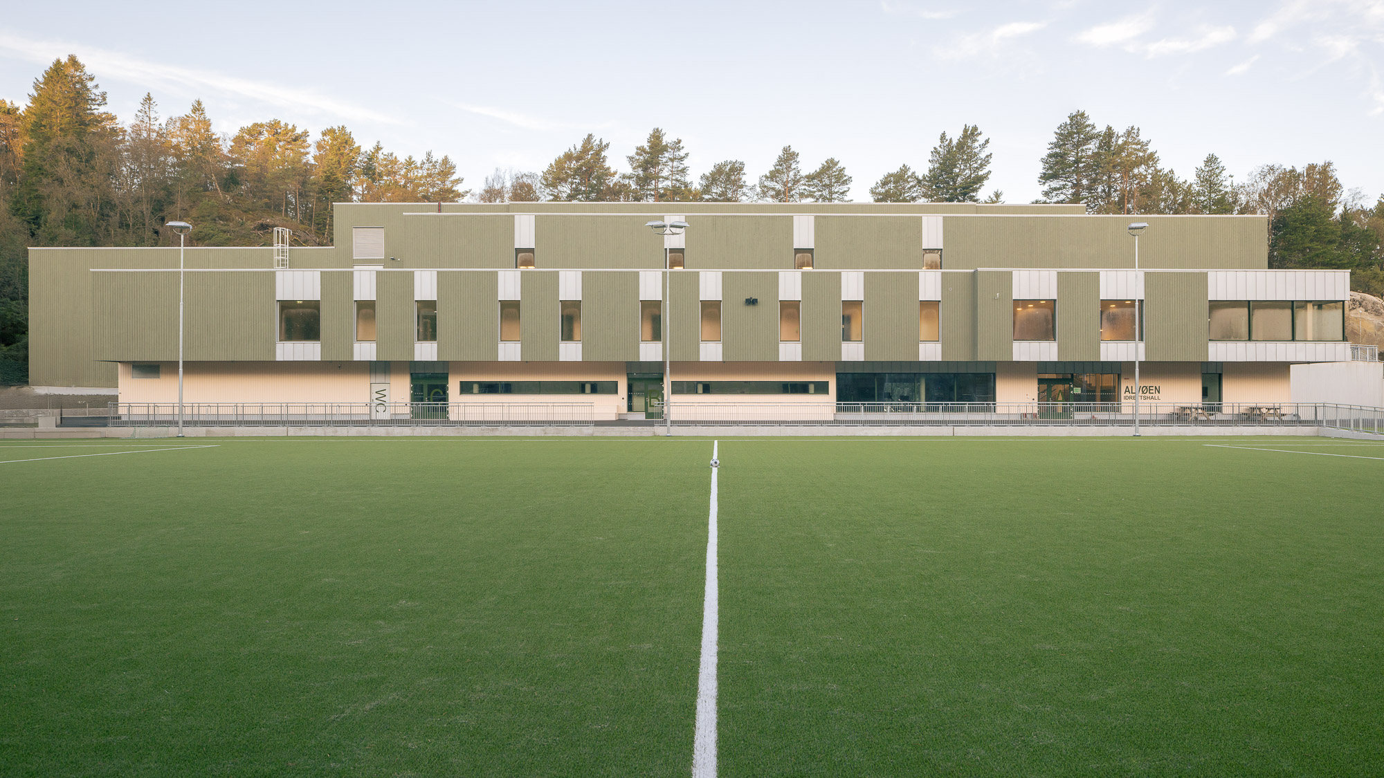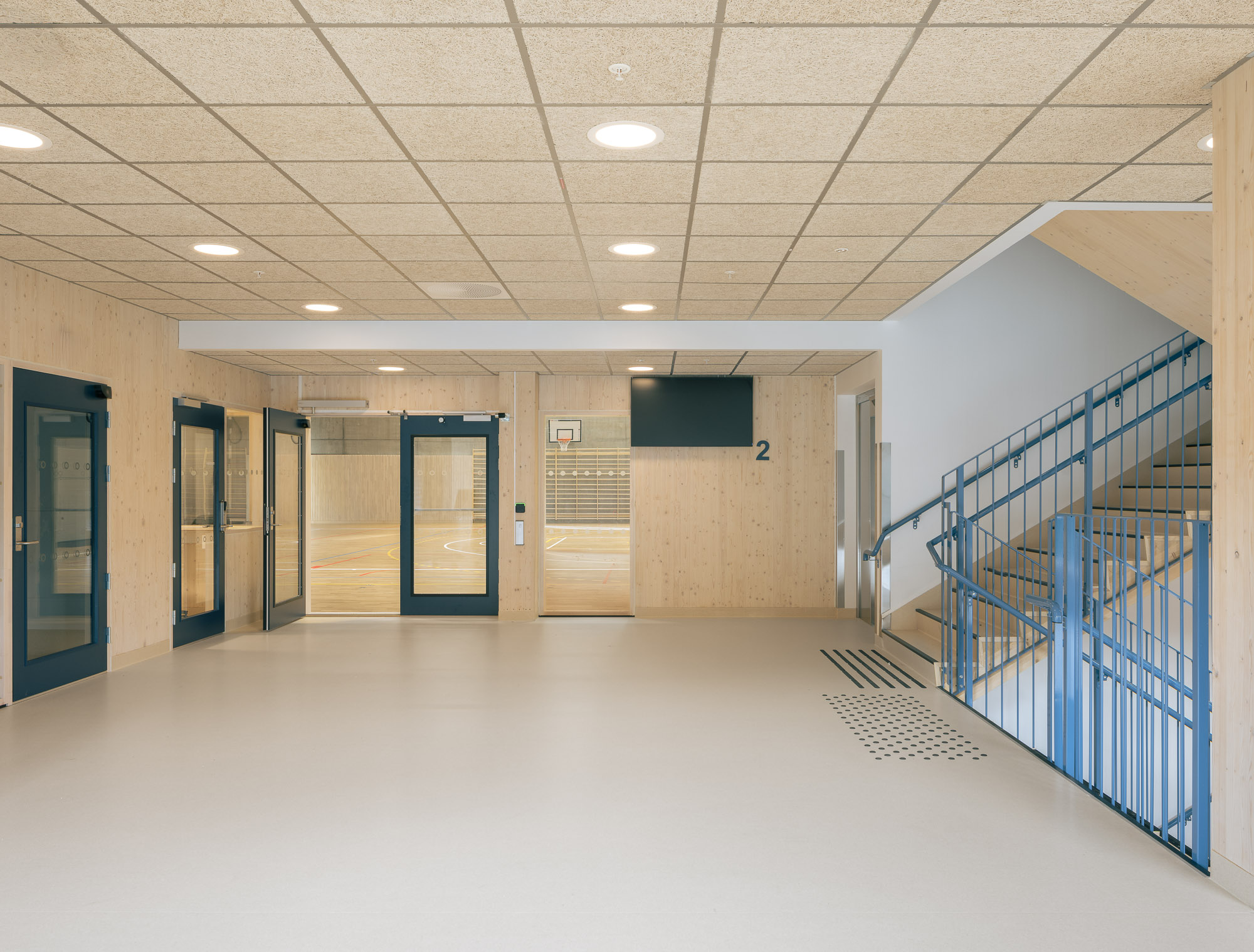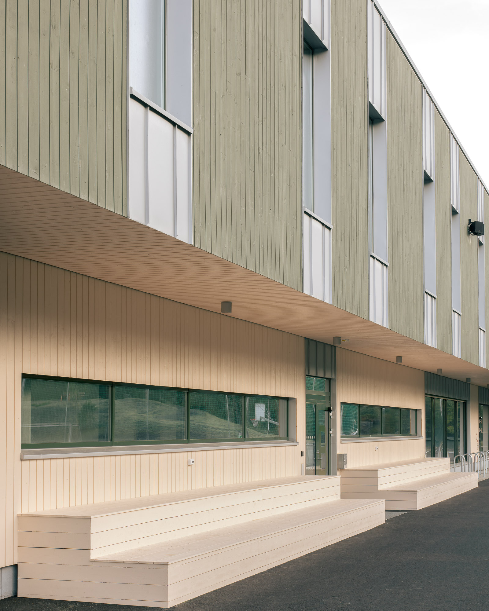The Sport Hall building has a rectangular shape and is composed by two main volumes: the larger sports court and a smaller three-storey block. In the sports court, the roof loads are carried by timber trusses that transfer forces to the concrete walls and down into the foundations on one side, while in the stands area the loads from the roof trusses are taken by a beam-truss system supported on two timber columns positioned above the concrete wall.