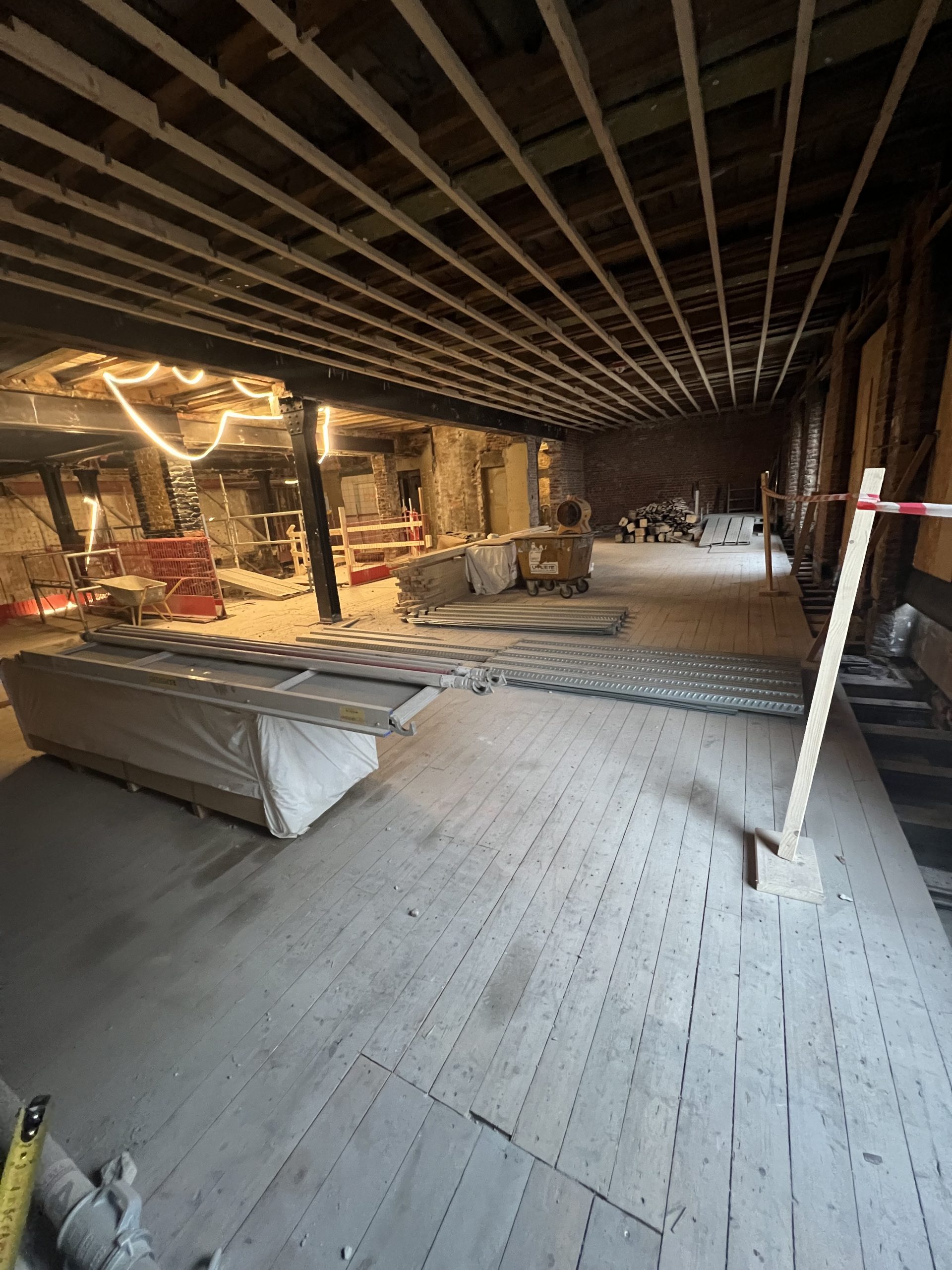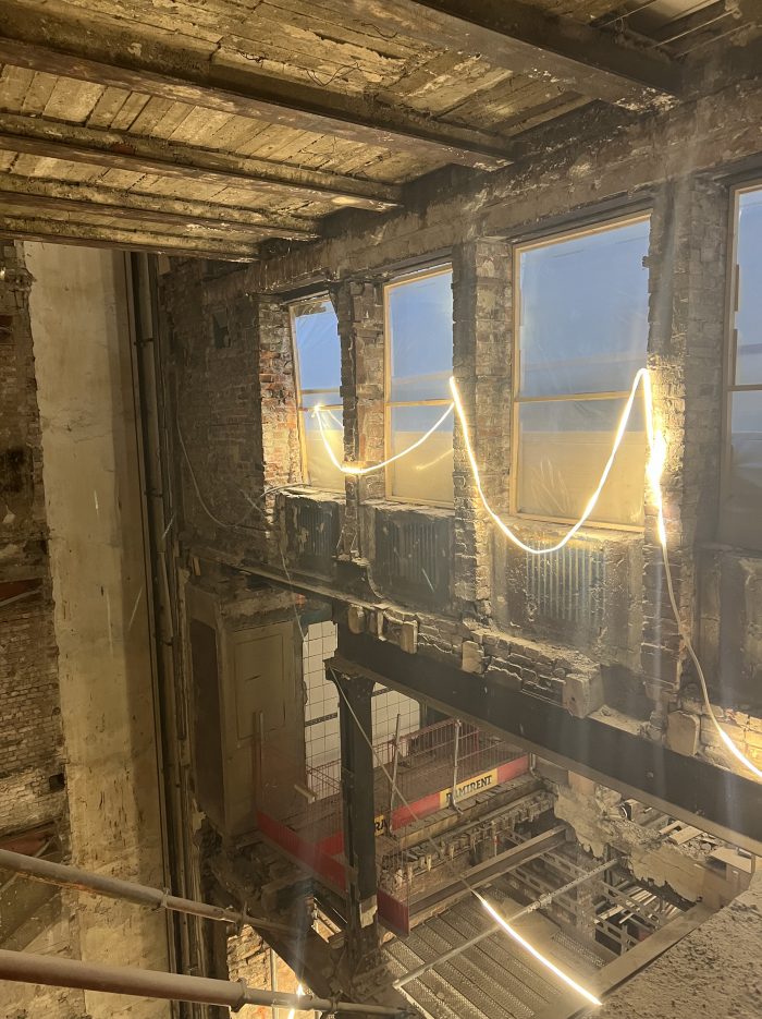 The existing construction is a combinationation of load bearing brickwork, steel columns and beams and concrete floor slabs. There is one original timber floor at DO1. The project requires demolition work, strengthening of parts of the existing structure and the addition of new structural elements.