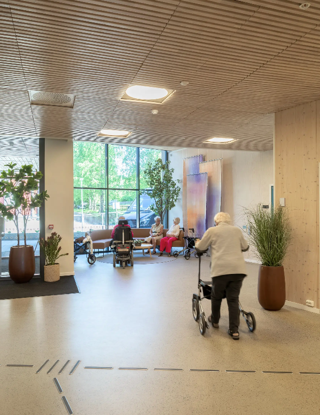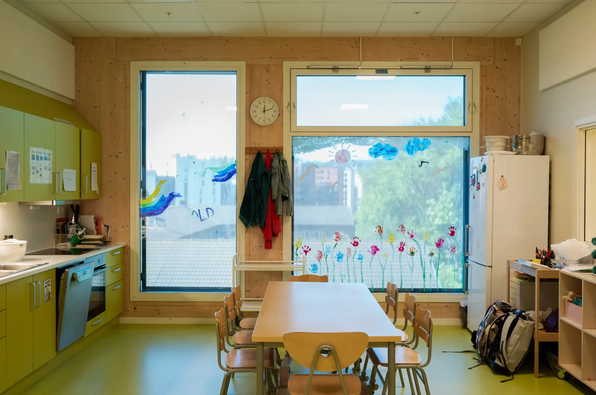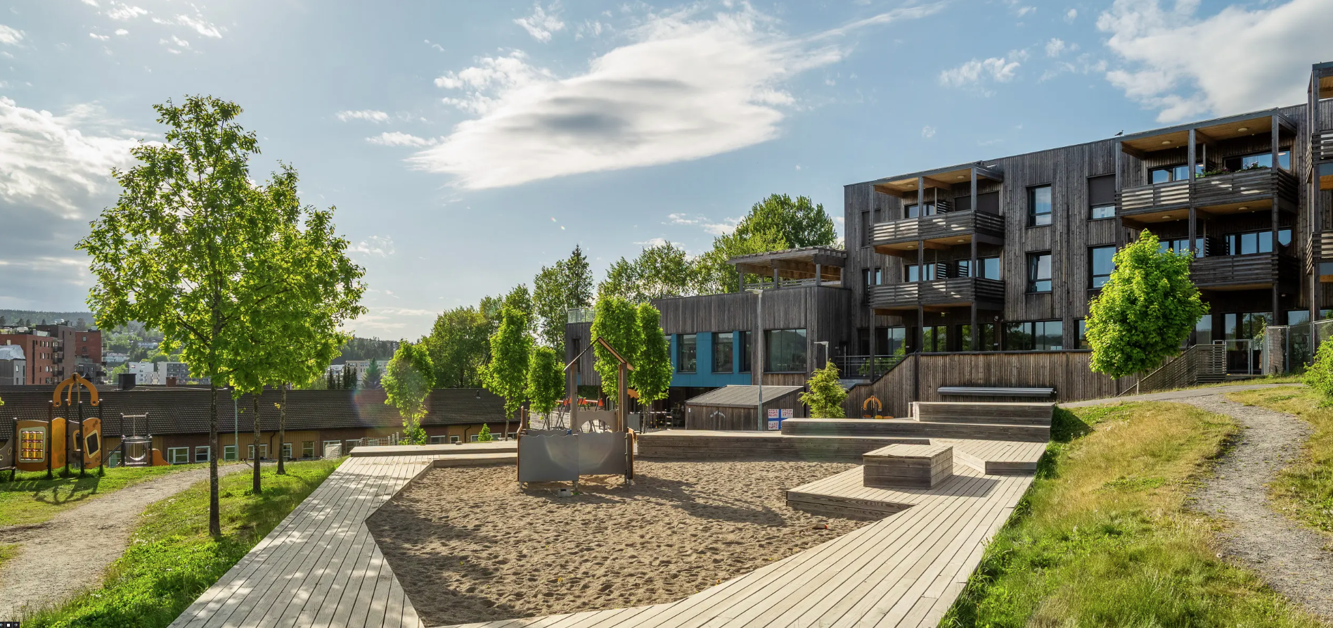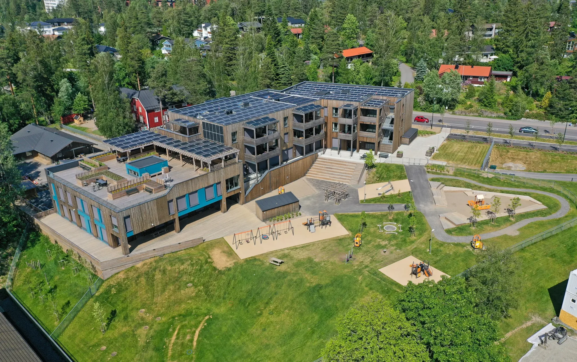 The building is designed to the Passive House standard which ensures extremely low heating needs. It is also supplied with a highly efficient heat pump that collects energy from the ground via geo-wells in the rock. The nursing homes and the kindergarten are designed for optimal thermal comfort, where both underfloor heating and floor cooling will take care of the thermal indoor environment for the building’s users.