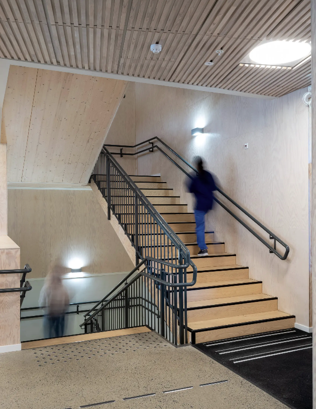 The structural bearing system is in CLT with some areas supported by glulam portal frames. Foundations and the basement parking are in-situ reinforced concrete.