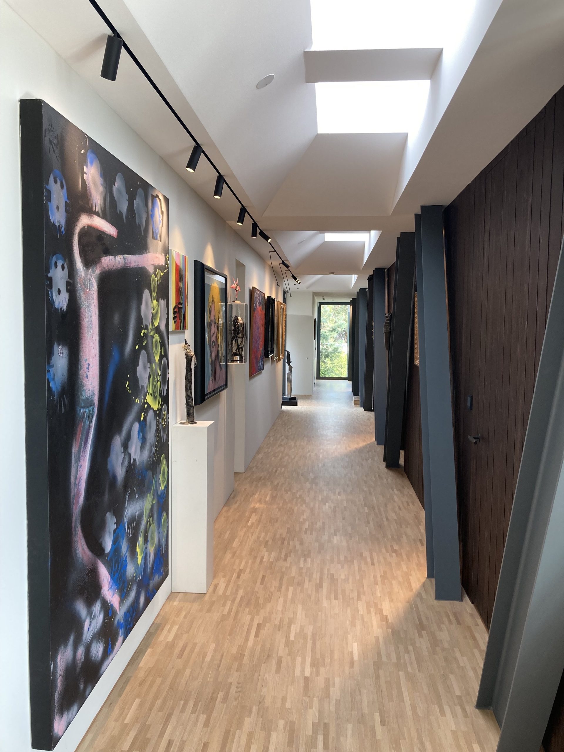 The addition is a small but spectacular signature building characterized by complex geometry and detailing; the concept is based on the idea of a “steel bridge structure”, fully visible in the finished building. Two-story trusses rest on two steel crosses on each side of the existing villa. The steel trusses make it possible to cantilever the structure over 10 meters to each side, thus establishing a carport in the east and a covered outdoor pool in the west. The “bridge structure/truss” also allow to form a continuous gallery of almost 30m, in which has been accommodate the extensive art collection of the Client.